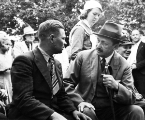Sotamarsalkka keskustelemassa sotasokean kanssa Kaivopuistossa Helsingissä 2. elokuuta 1940. Juuri tässä tilaisuudessa hän jakoi sotasokeille ensimmäiset valkoiset ”Marskin kepit”. Keppejä valmistettiin niin mustina kuin valkoisina Mannerheimin aloitteesta ja hänen antamansa mallin mukaan. Ne rahoitettiin rahaston varoista. SA-kuva.